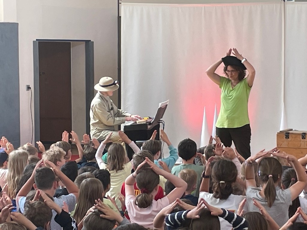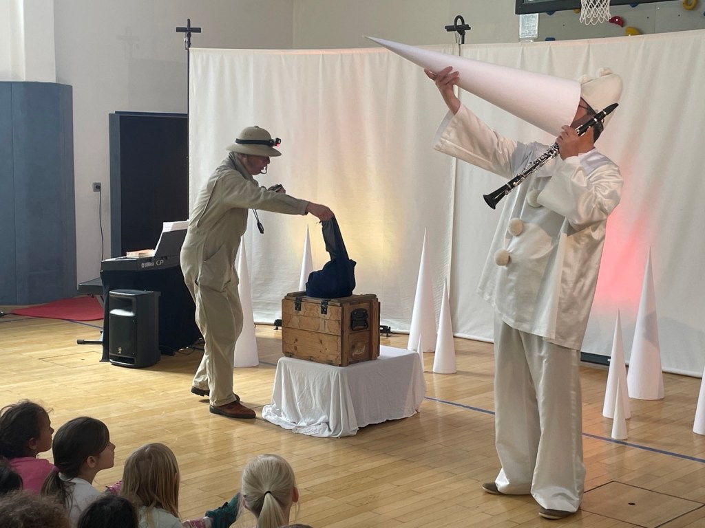 Alle Kinder der Schule bereiteten das Konzert im Musikunterricht vor und konnten so die Strukturen – insbesondere der Mitmachstücke – durch die Gestaltung mit Bewegungen erfassen. Es war beeindruckend zu sehen, wie gebannt unsere Schülerinnen und Schüler zuschauten und zuhörten und in das Stück „Die Klarinette und das Buch der Träume“ eintauchten. Eifrig begleiteten sie beispielsweise die Variationen zum Stück „Mein Hut, der hat 3 Ecken“ mit Bewegungen oder „Le petite négre“ von Claude Debussy rhythmisch.